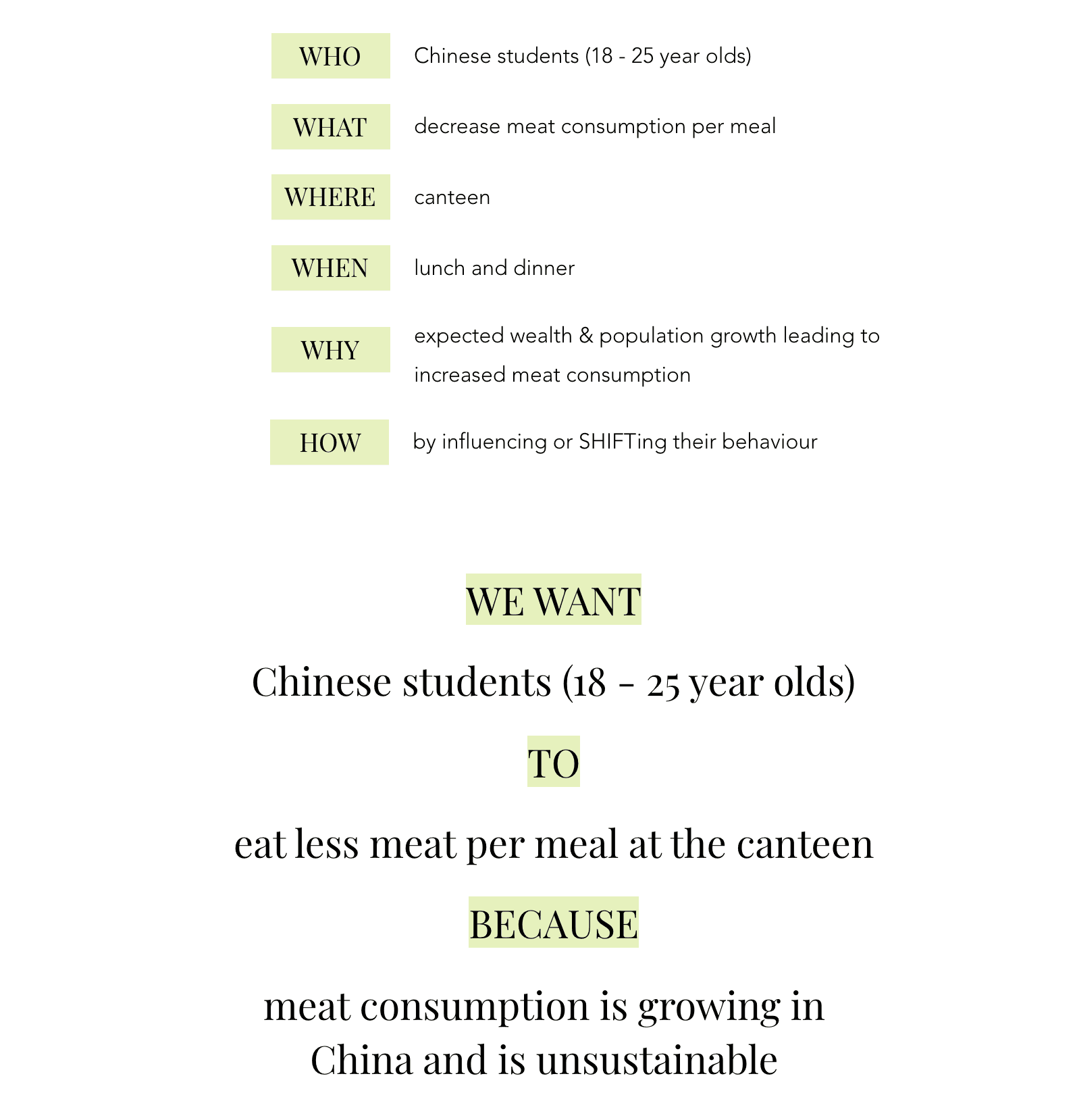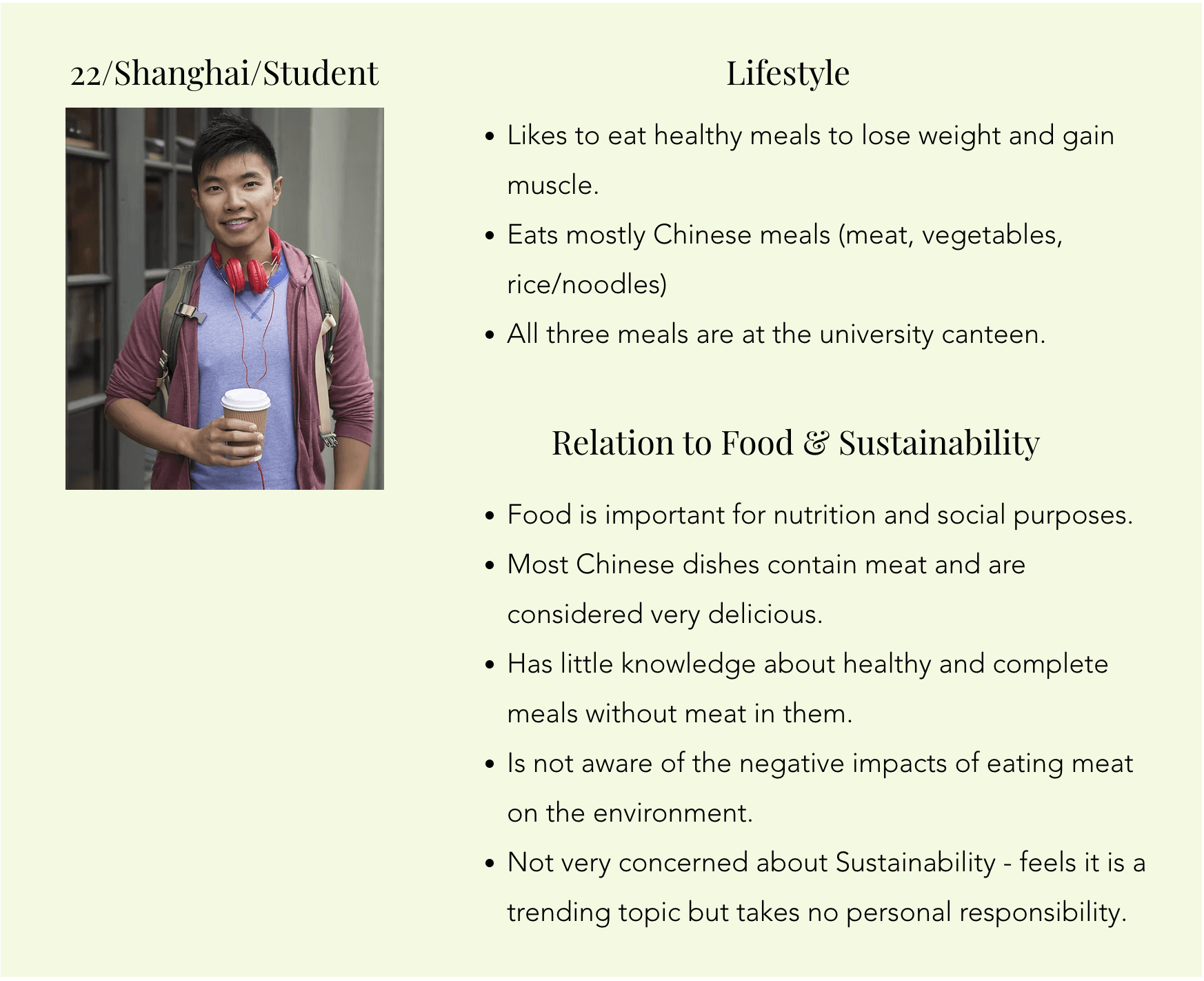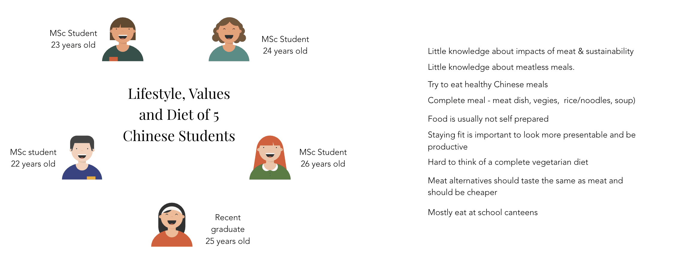 Focusing our design on the Chinese Population, we needed a more specific target group. We chose to design for Chinese Students because of their ability to have a longer lasting impact, they are more flexible in their habits, and are more likely to reflect critically on their habits. In order to gain an understanding of the lifestyle, values and diet of Chinese students we conducted interviews of 5 Chinese students.