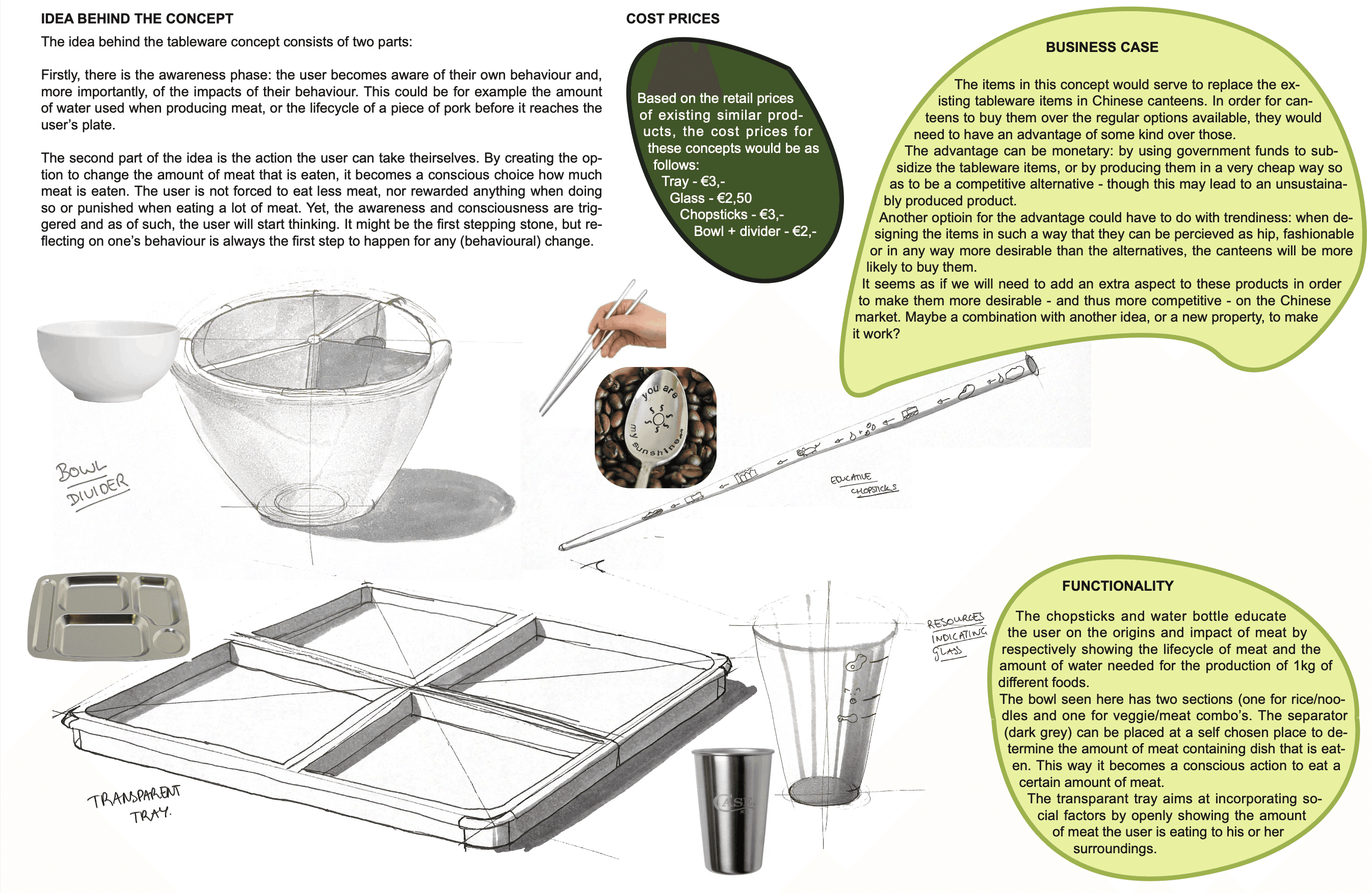 The ideas selected using the C-Box were SCAMPERed and developed into three different concepts for the Chinese canteens. All three concepts were detailed with main idea behind the concept, business case and cost estimation. We selected the most important wishes from our programme of criteria and using the Harris Profile, we evaluated them. After a thorough discussion we decided to further detail the Dynamic Wall concept and include the Canteen Tableware concept in the solution trajectory.