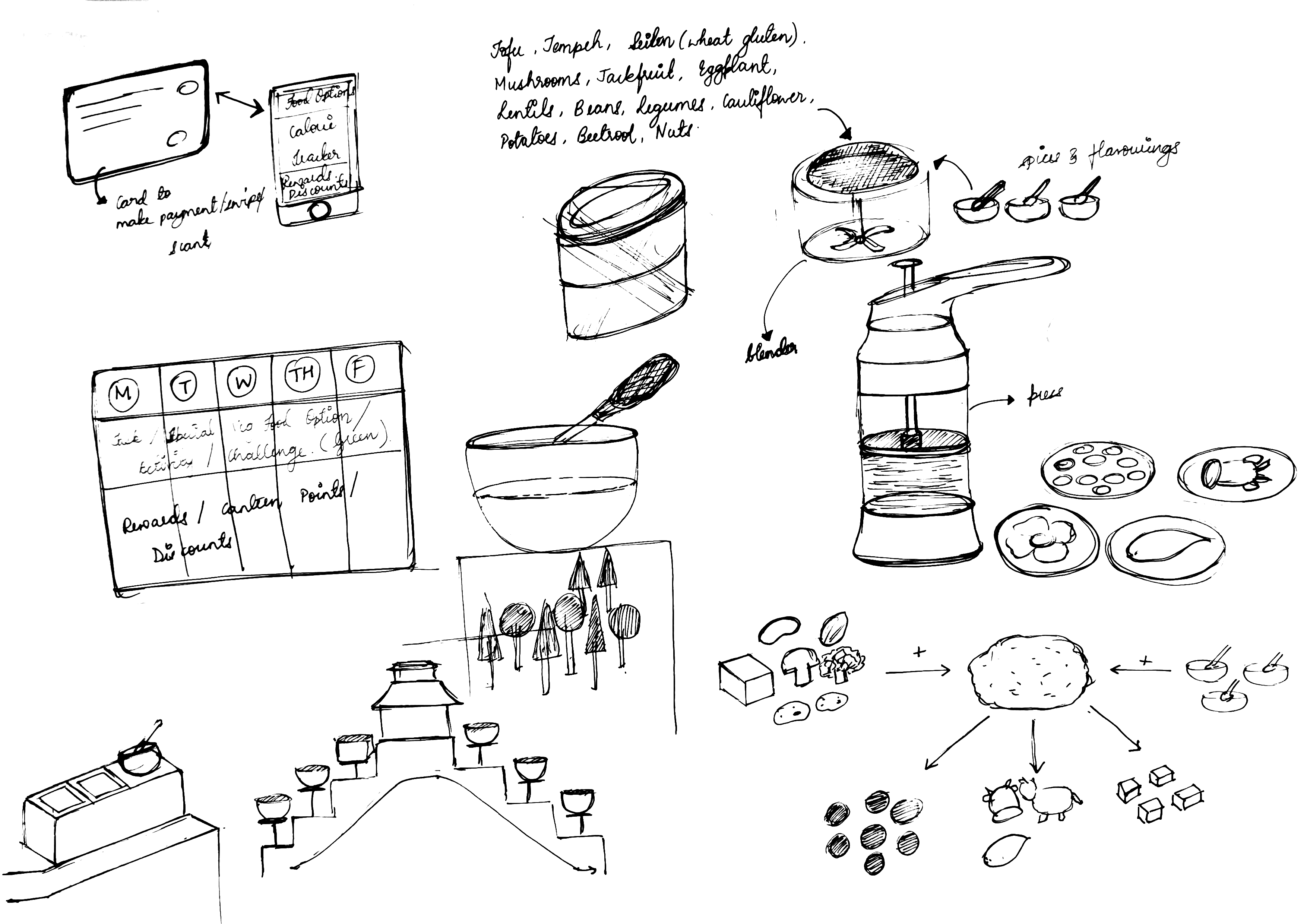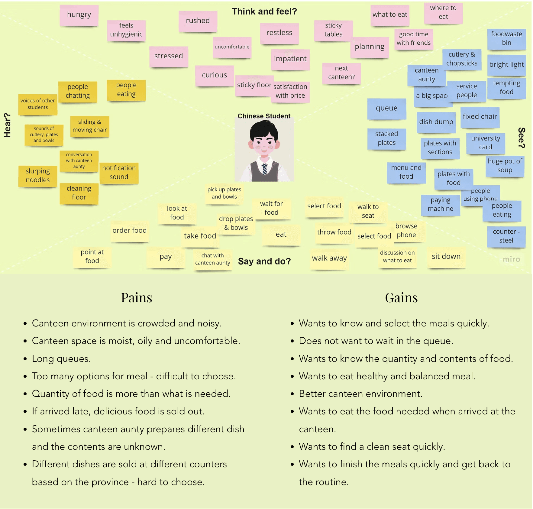 To develop a deeper understanding of the target group we were designing for and understand their needs, we worked on an Empathy Map. The experience of a Chinese student in a Chinese canteen is summarised in an Empathy Map as what he sees, says and does, hears, thinks and feels. The pains represent the fears, frustrations and obstacles. The gains represent the wants, needs, success and goals.