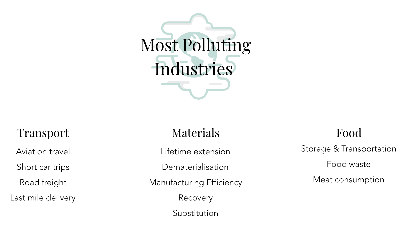 To start off the project, my team and I researched about Environmental Sustainability. This research was done not only to increase our overall understanding of the issue but also to identify those areas which are most pressing to design for - which were researched more in detail. There are three aspects to sustainability: environmental, economic and social. A systemic change that addresses all three aspects of sustainability is necessary but for the scope of this project, we will focus on Environmental Sustainability. We researched about three most polluting industries - materials, transport and food. We identified the key areas in each domain.