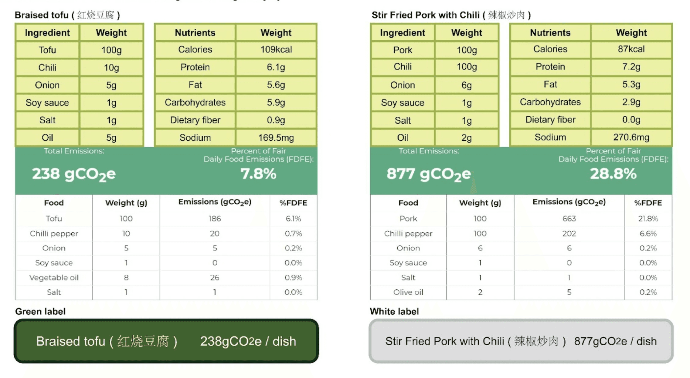 We selected two common Chinese dishes served at the canteen and calculated their carbon footprint values using a calculator. Values of other dishes can also be calculated in the same way. We also categorised the dish labels that will be placed in front of the dishes in the canteen.