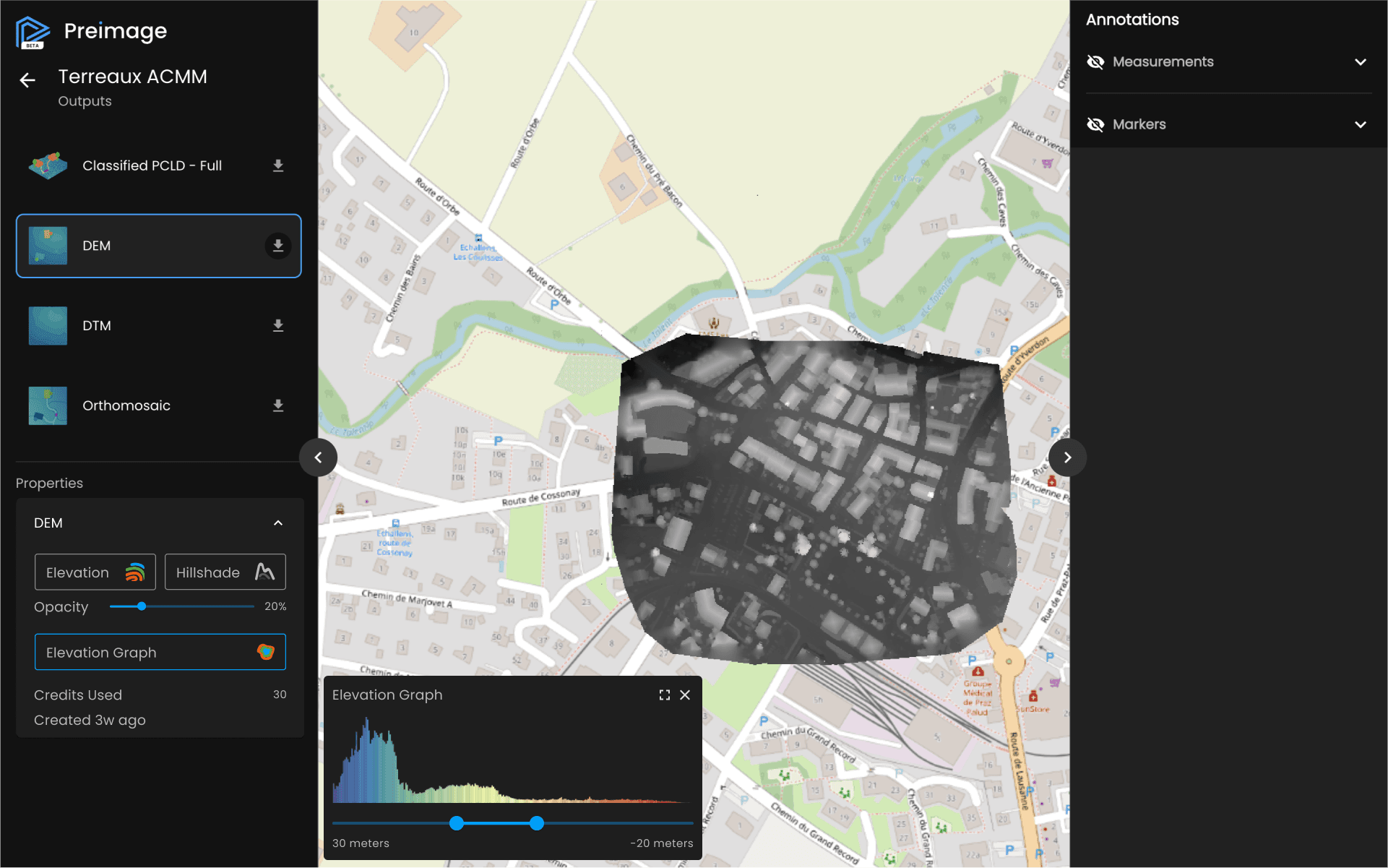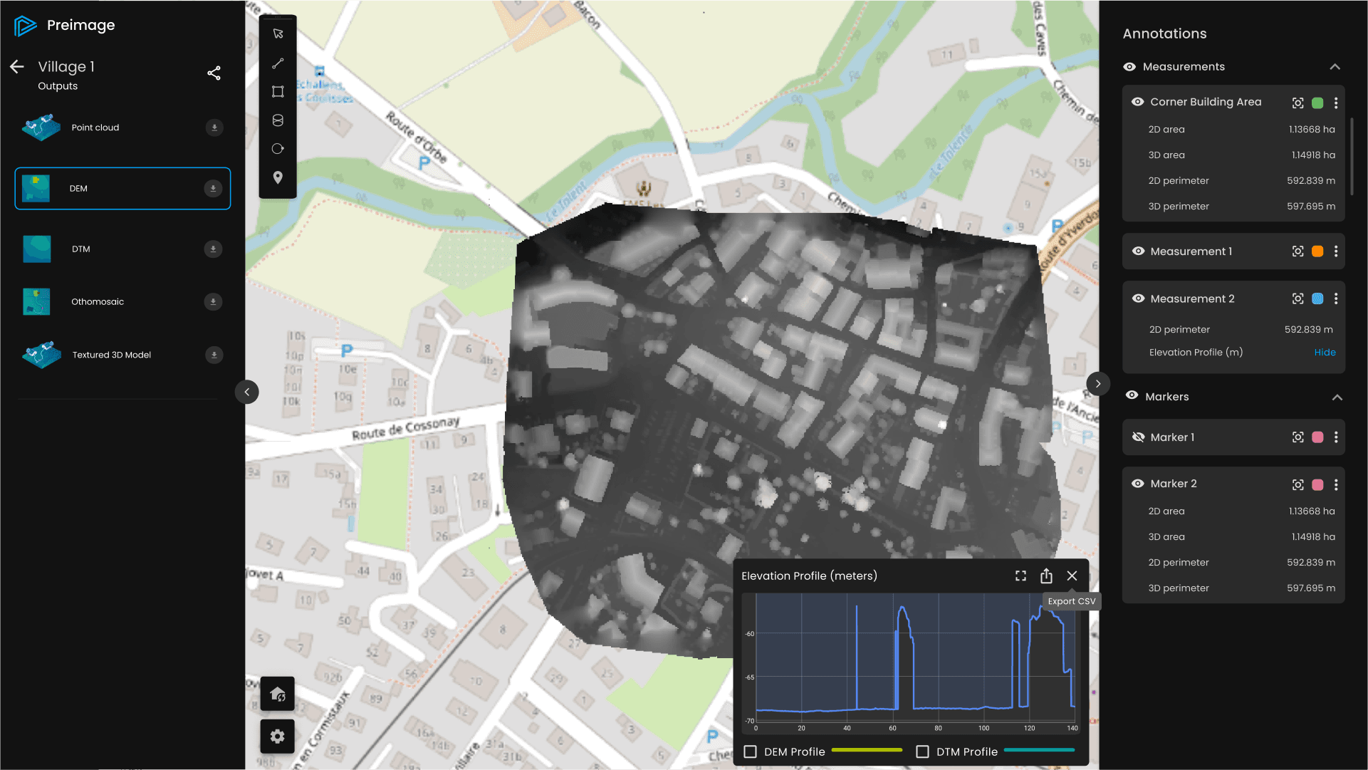 For more in-depth analysis, the Viewer allows users to make measurements such as lines, areas, and volumes. Furthermore, it provides an elevation graph and elevation profile of lines, offering valuable insights into the terrain's elevation data.