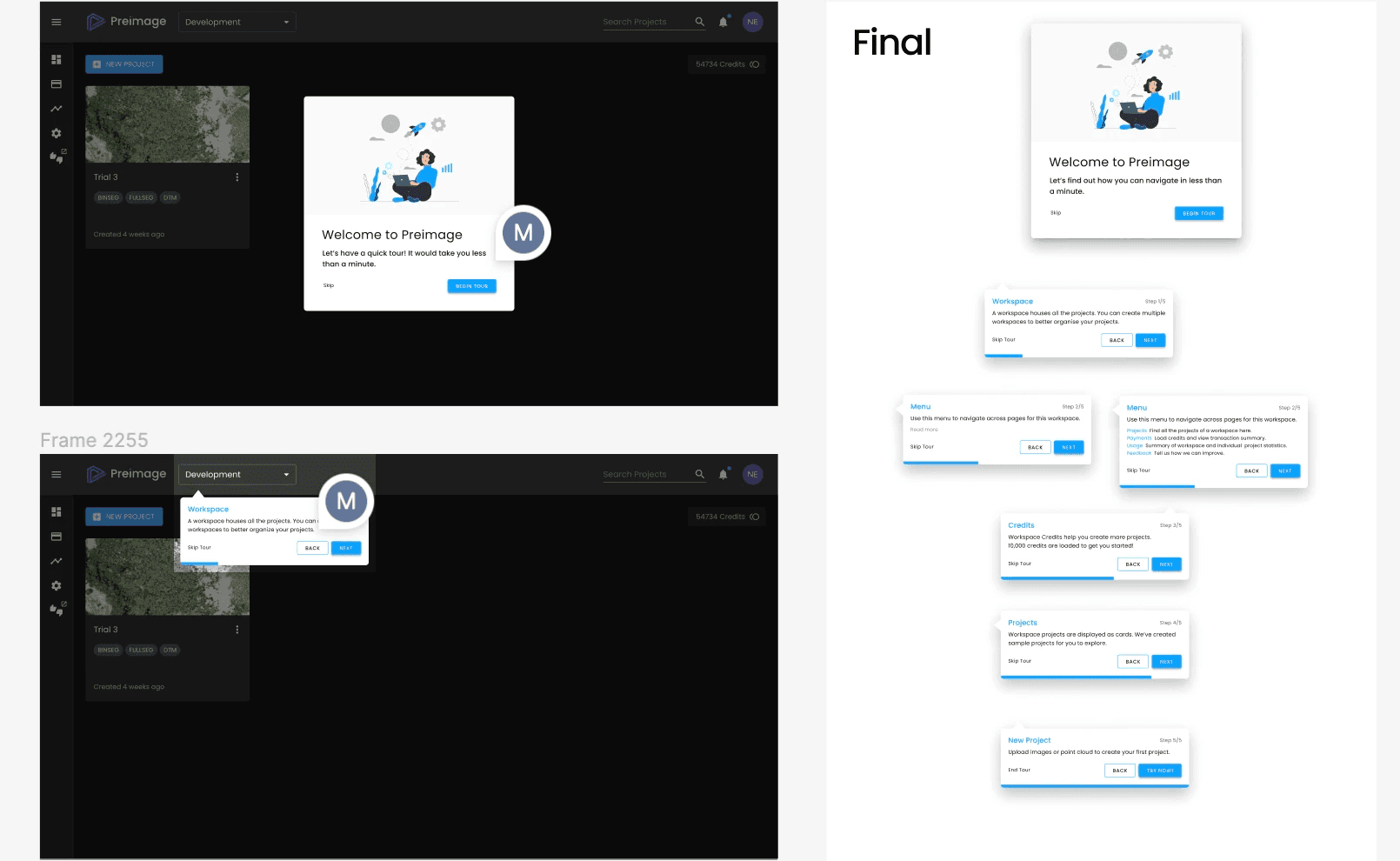 Mapped core flows for project upload, processing, and 3D exploration, shaping journeys for both individuals and teams. Built early wireframes and clickthroughs to validate navigation, then refined them with team feedback and engineering input to create a smoother, more intuitive experience.