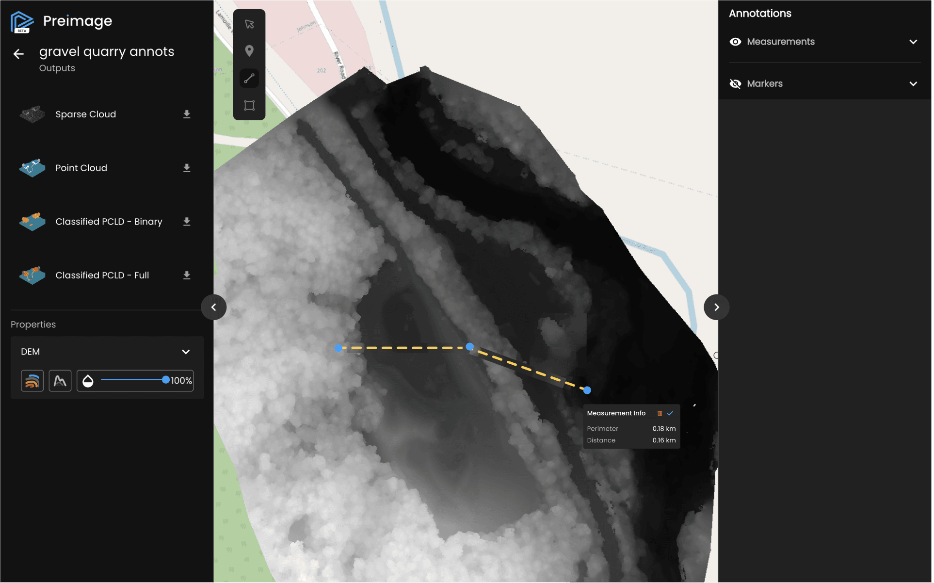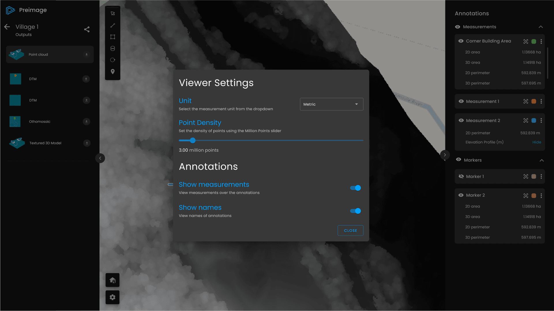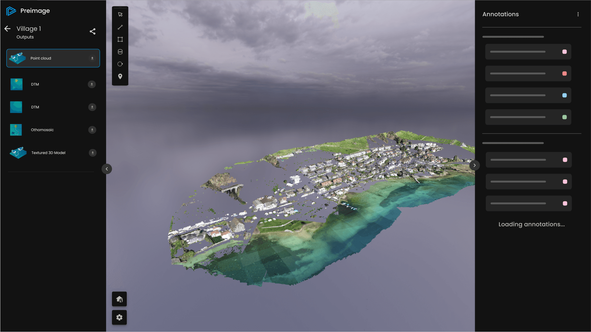 The Preimage Viewer complements the web app by allowing users to view the point cloud and raster outputs processed through it. The interface provides a seamless way to view these visual representations.
