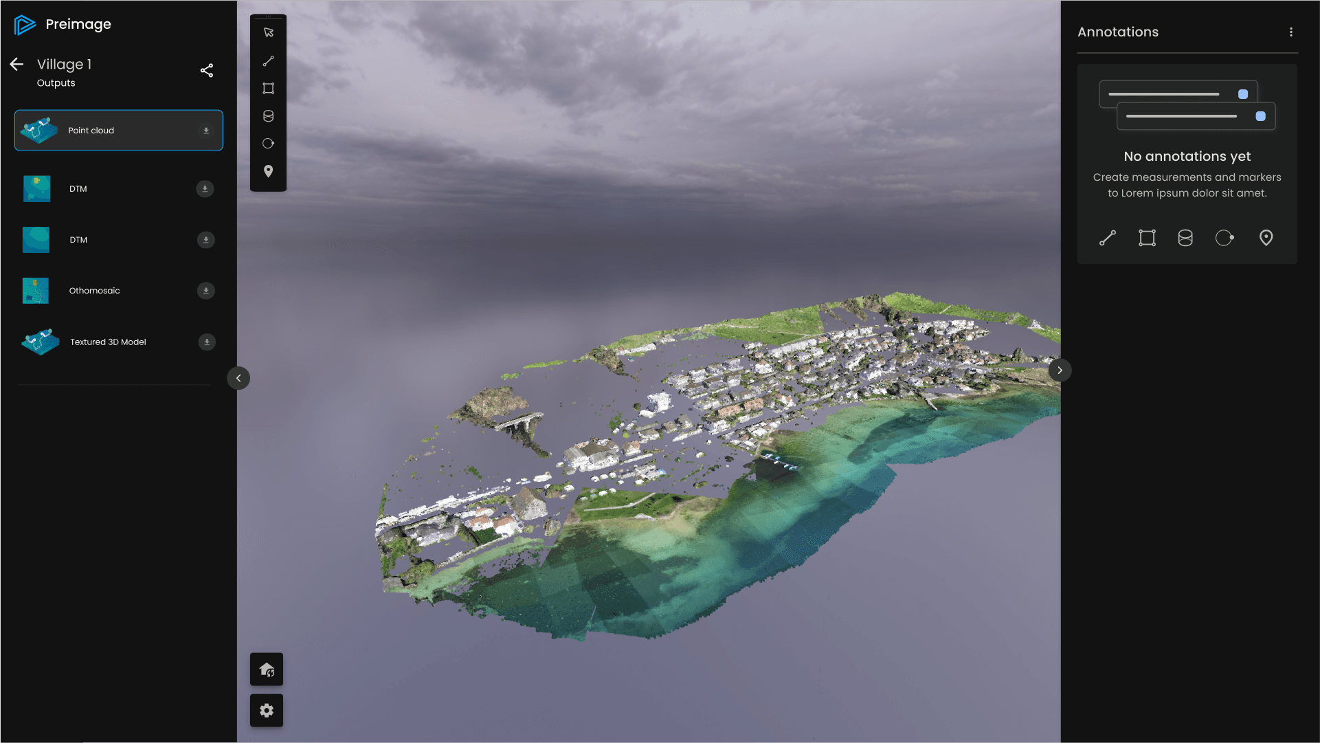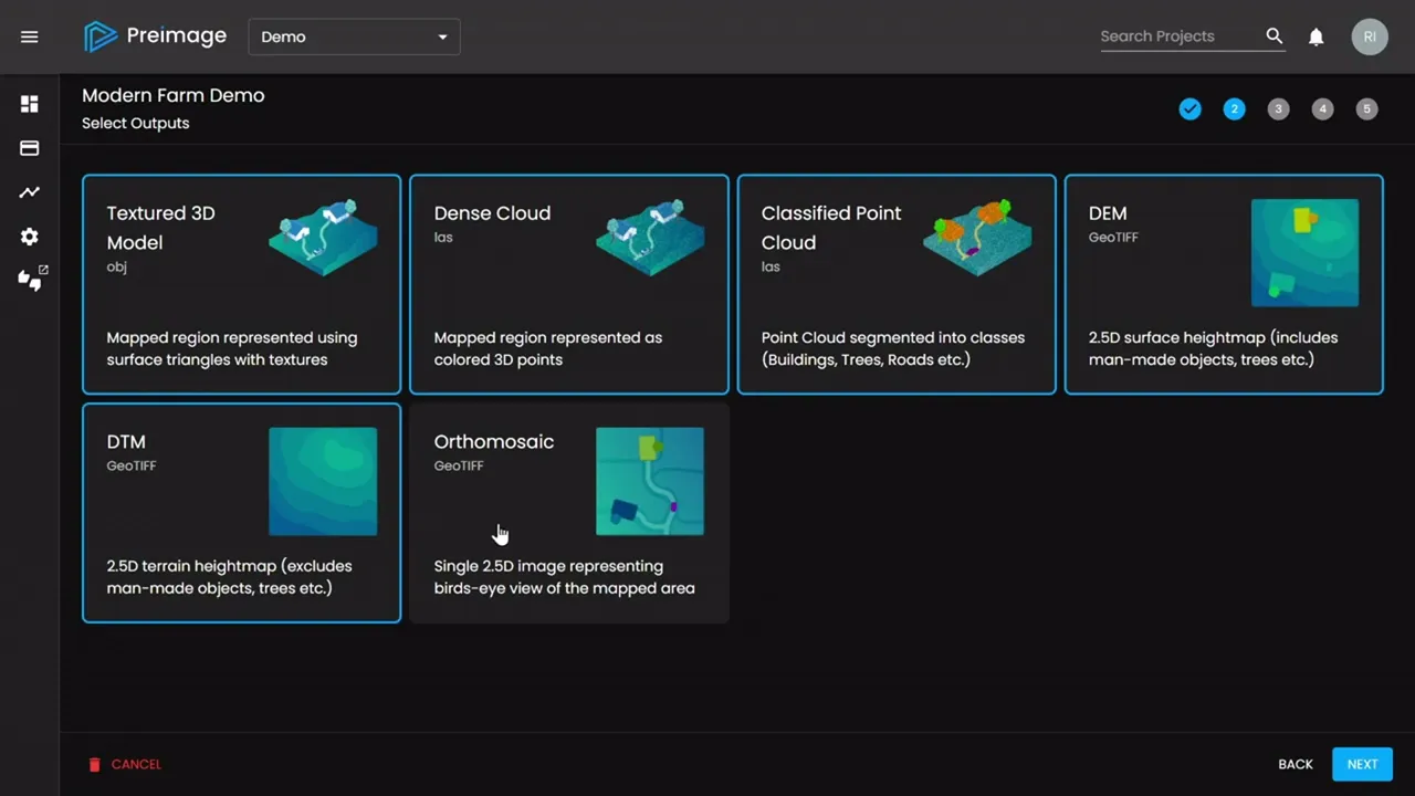 Preimage responsive web app is designed to process images and point clouds, generating and viewing various outputs like Sparse Cloud, Dense Cloud, Fully Classified Point Cloud, Binary Classified Point Cloud, DEM, DTM, and Orthomosaic.