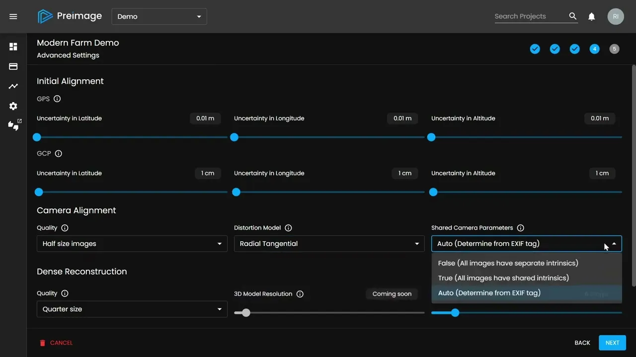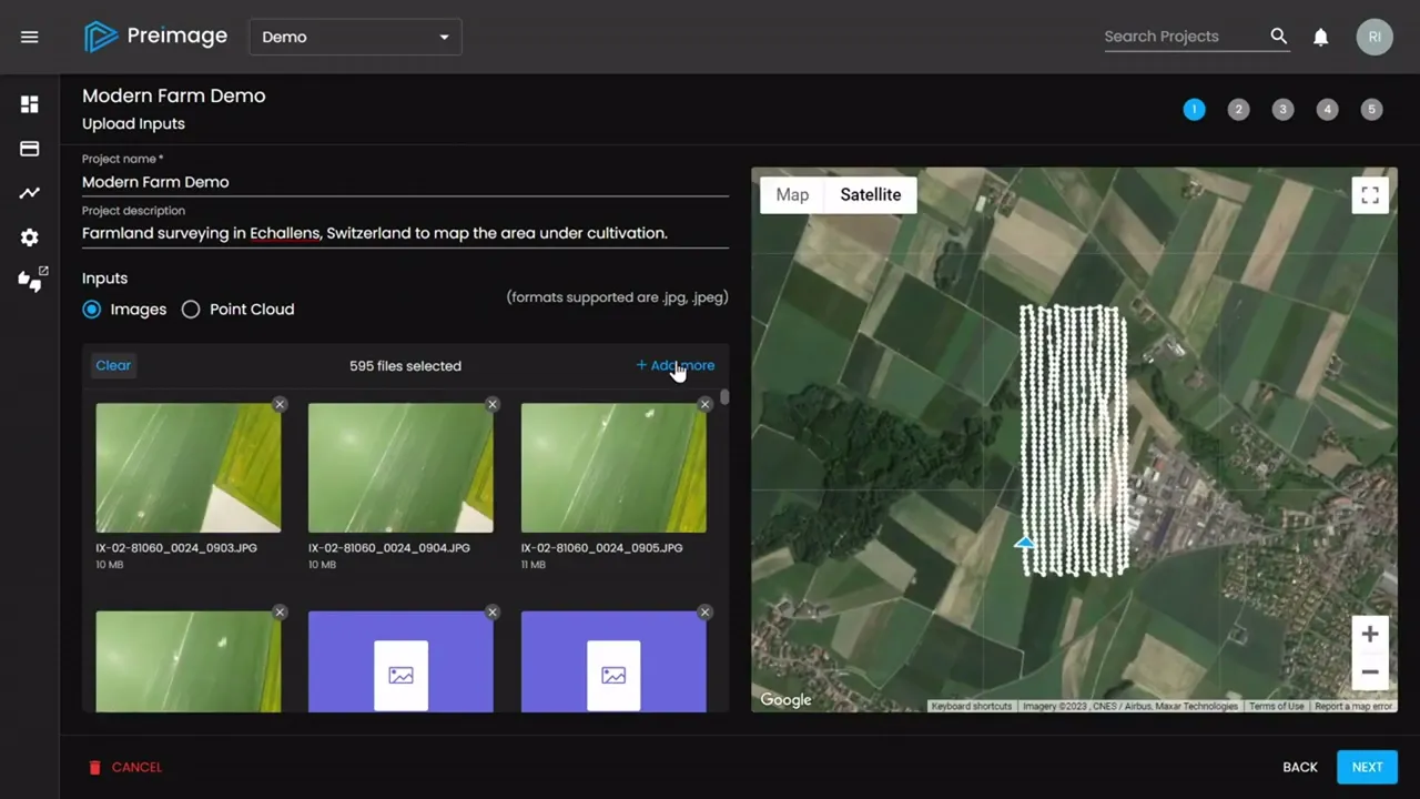 The project creation flow consists of 5 main steps: uploading inputs, selecting desired outputs, importing CSV files and marking GCPs (Ground Control Points), and configuring reconstruction settings.